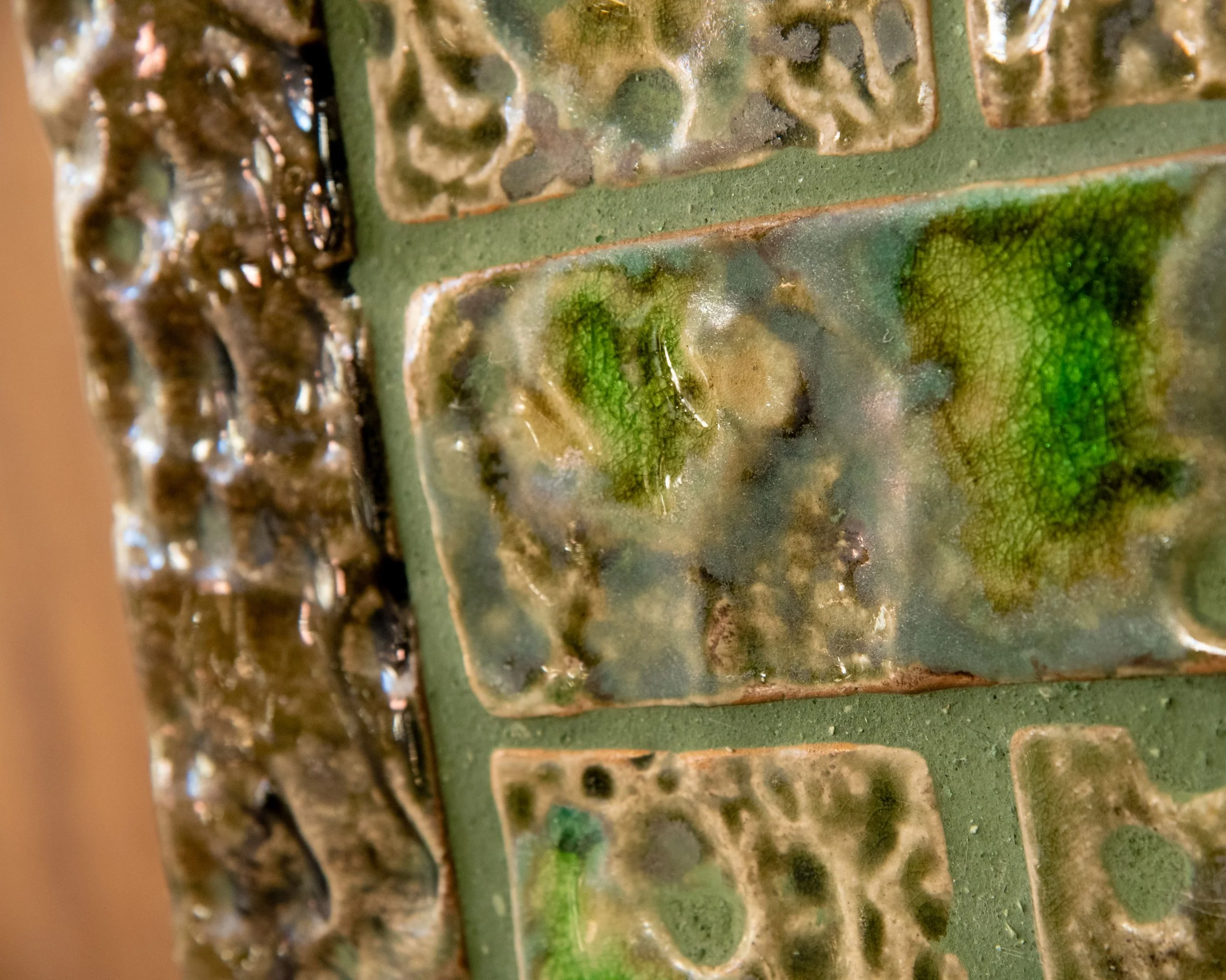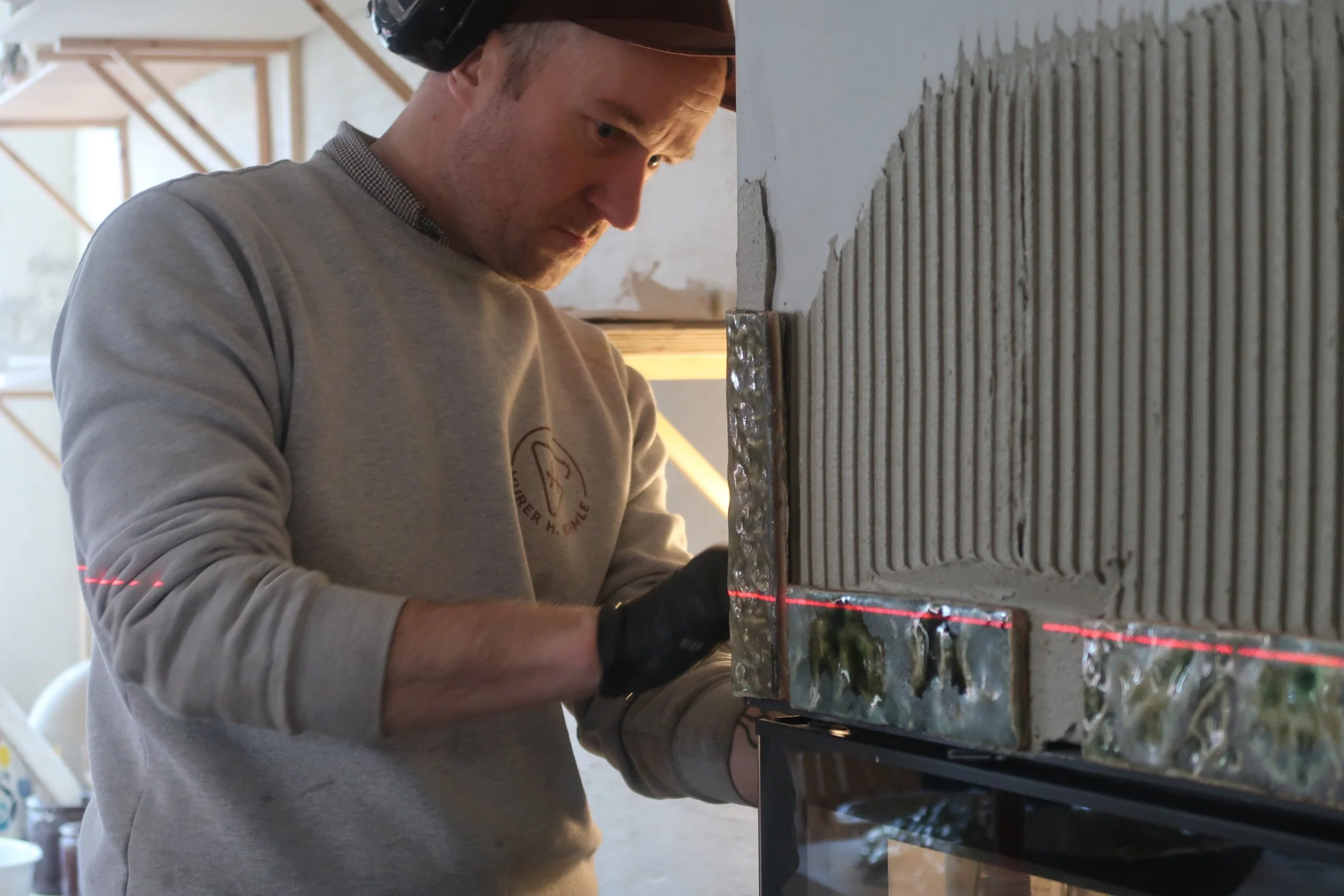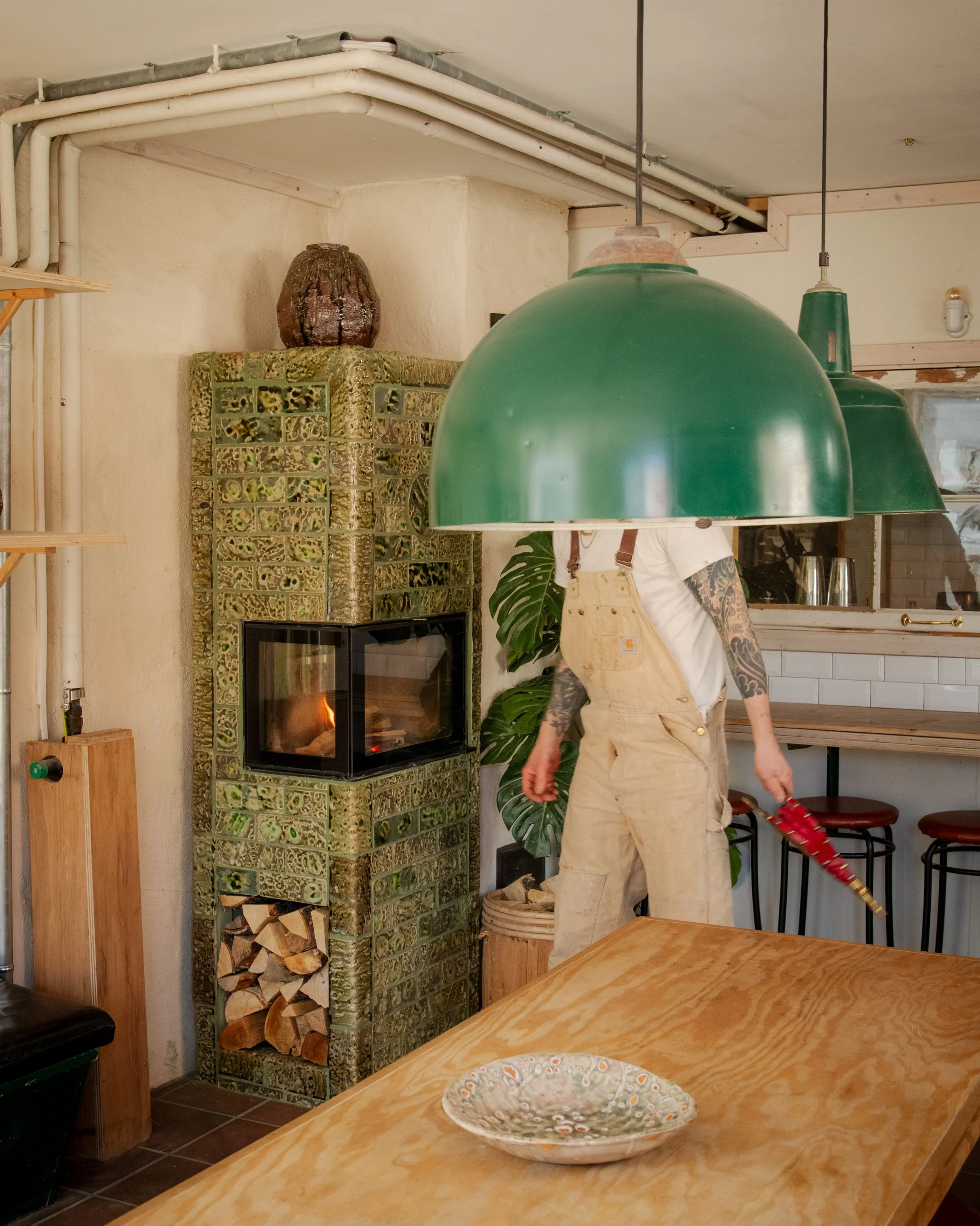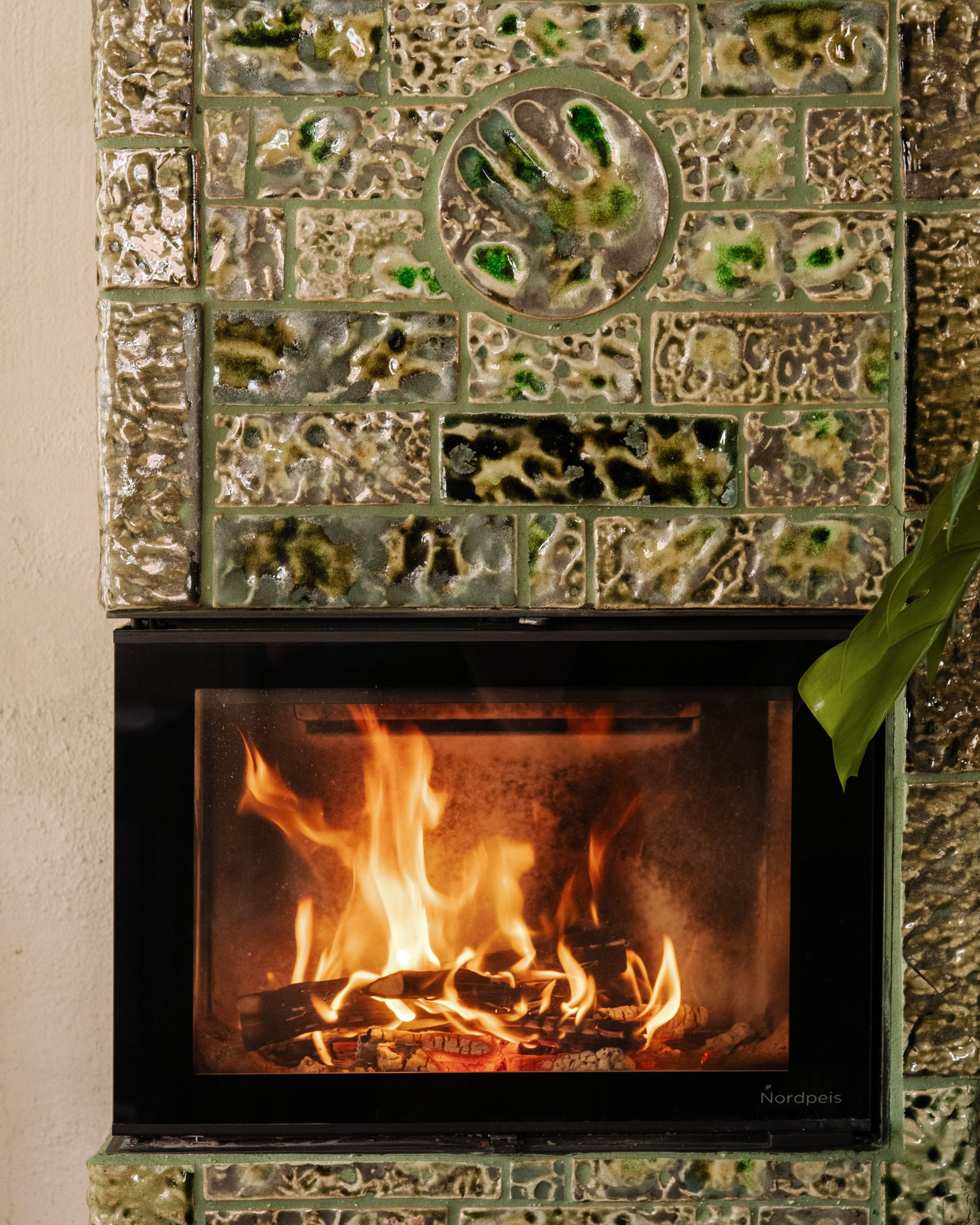 The tiles were crafted on-site, their surfaces finished with a glaze made from the very ash that the fireplace has already made, along with fragments of green glass from recycled beer bottles. Each piece is a quiet dialogue between past and future, material and memory.