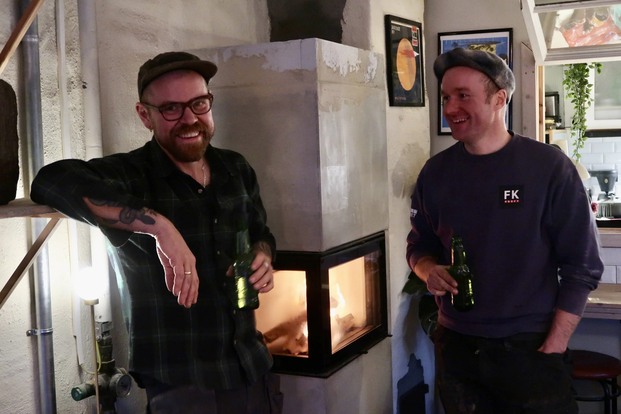 Halvdan Gimle og Halvor in front of the fire place, each with a green glass beer bottle that was used among the tiles around the oven.